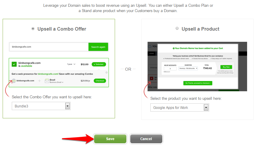 You may choose to upsell either a Combo Plan or any other product. Click on Upsell a Combo Plan or Upsell a Product as required.