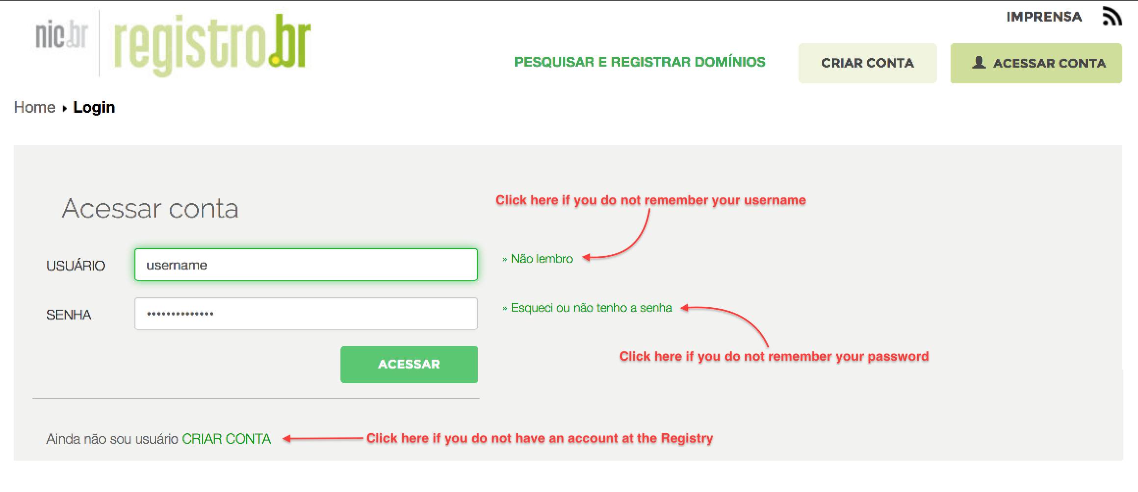 1. Log in to the .BR Registry panel at https://registro.br/cgi-bin/nicbr/login.