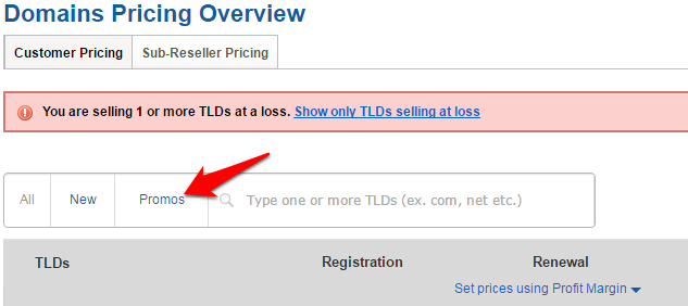 • Click on the Promos link to list the TLDs with available promos.