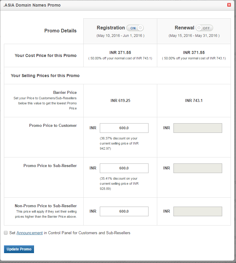 • You may modify the Promo Price to Customer, Promo Price to Sub-Reseller and Non-Promo Price to Sub-Reseller at any time.
